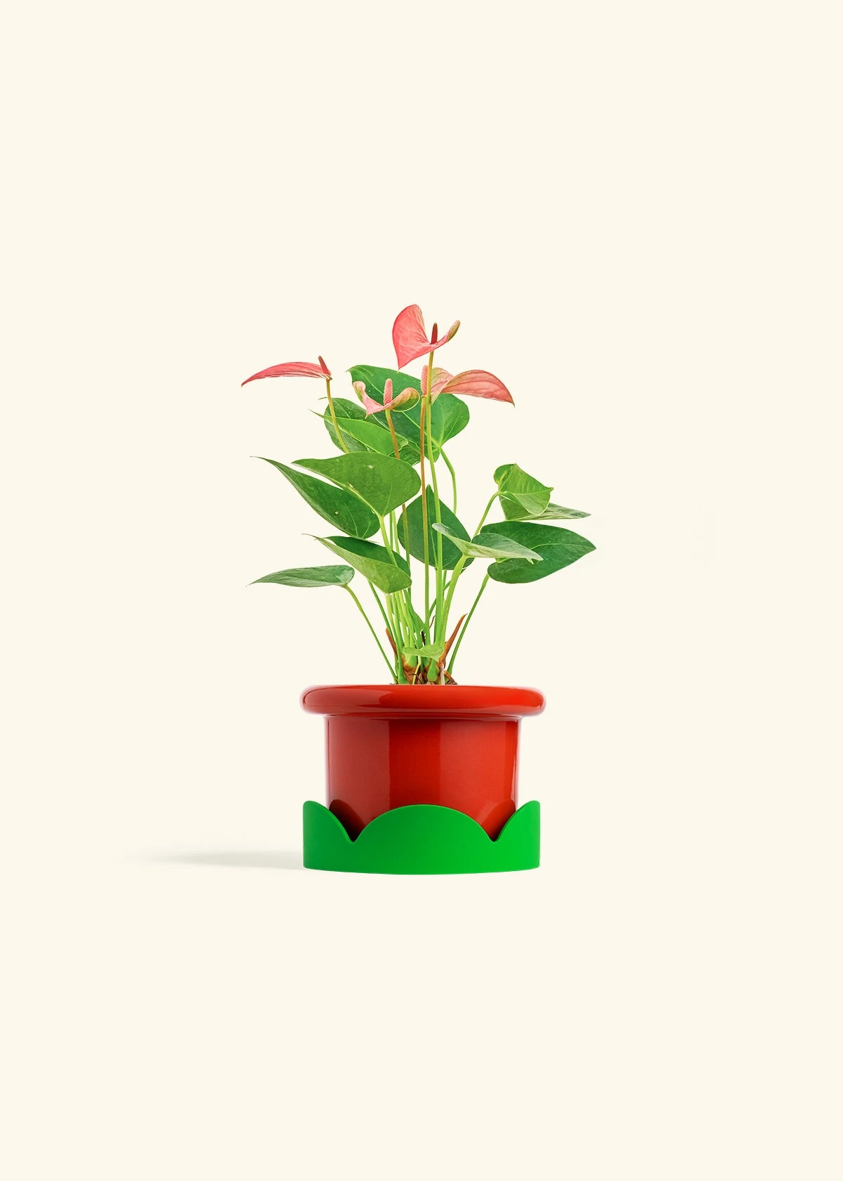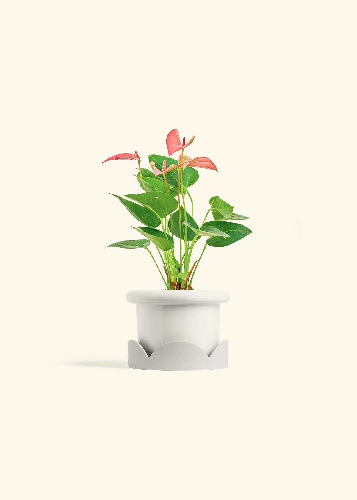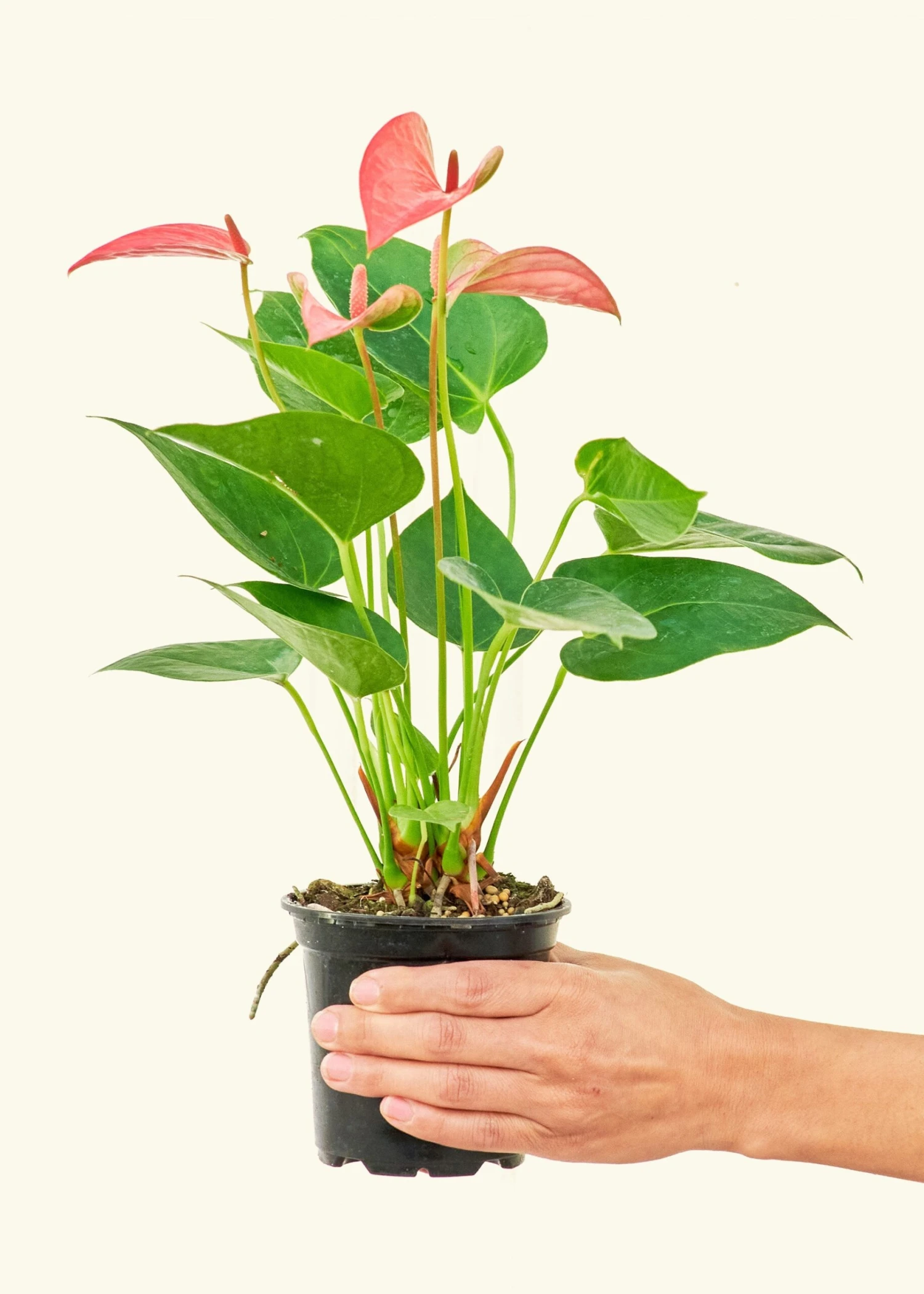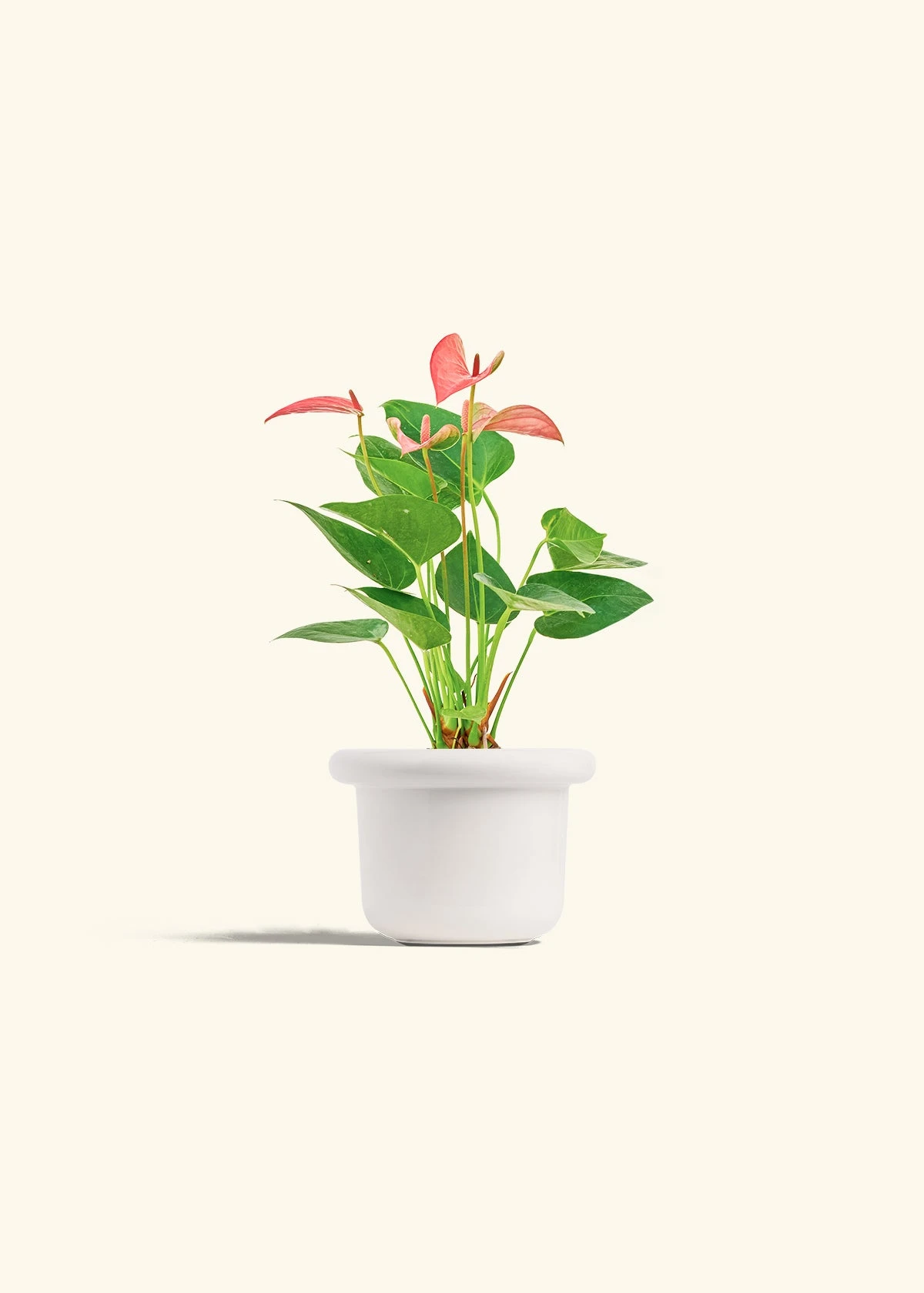 This anthurium has beautiful, pink, heart-shaped “flowers” which are actually morphed leaves called spathes. Anthurium spathes are brightly colored to attract pollinators to the spadix (the flower spikes in the middle). It’s fairly low-maintenance, and blooms can last for 2-3 months in the right conditions.