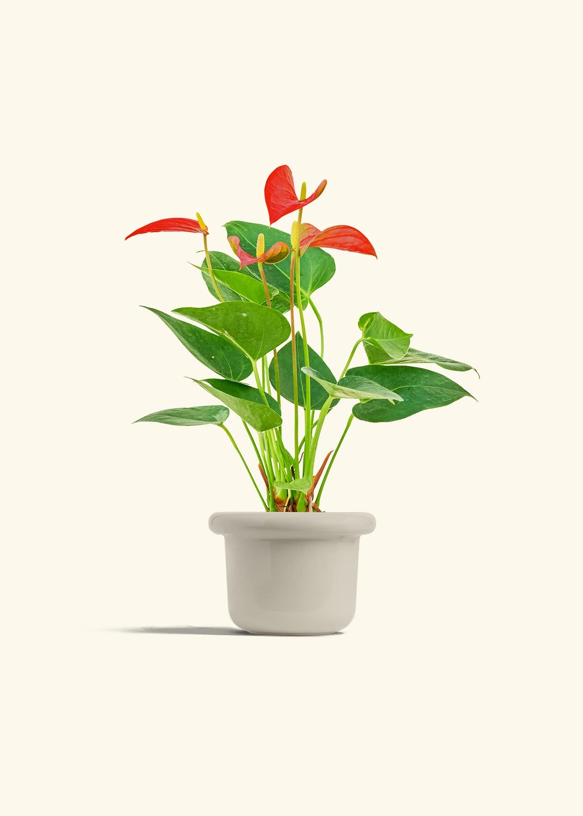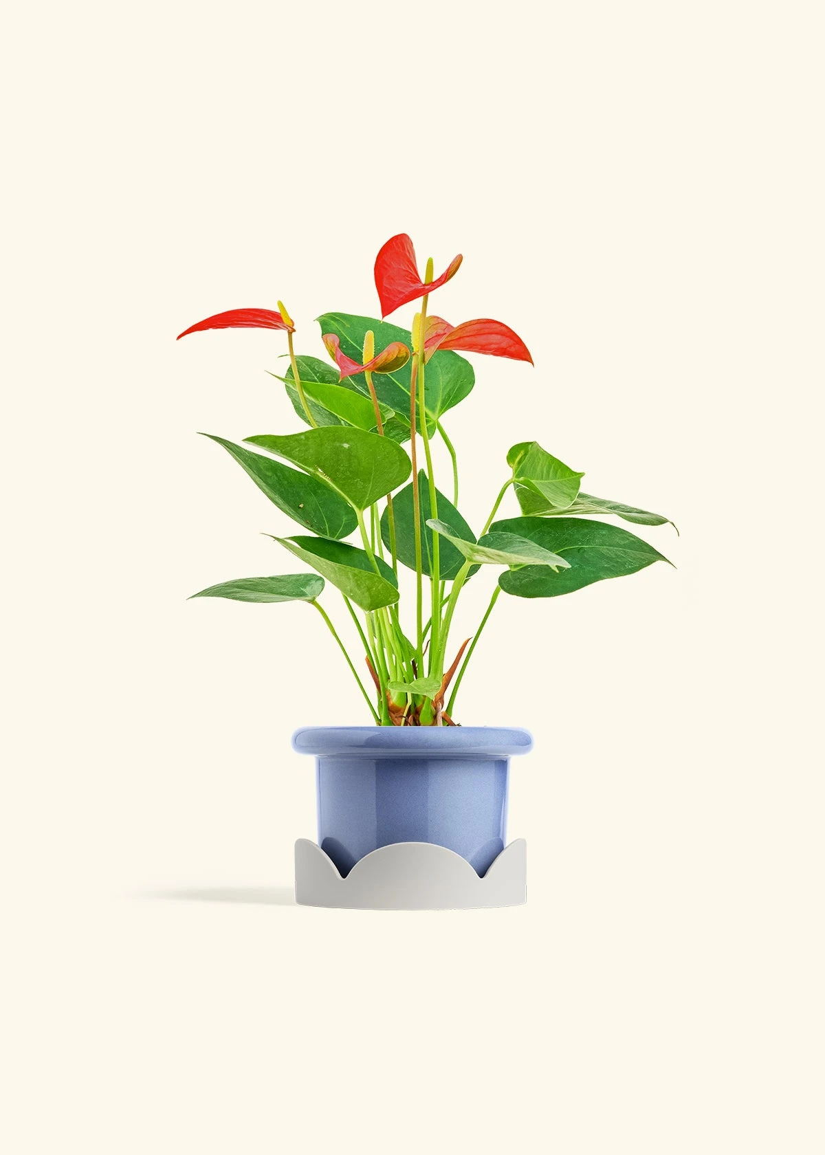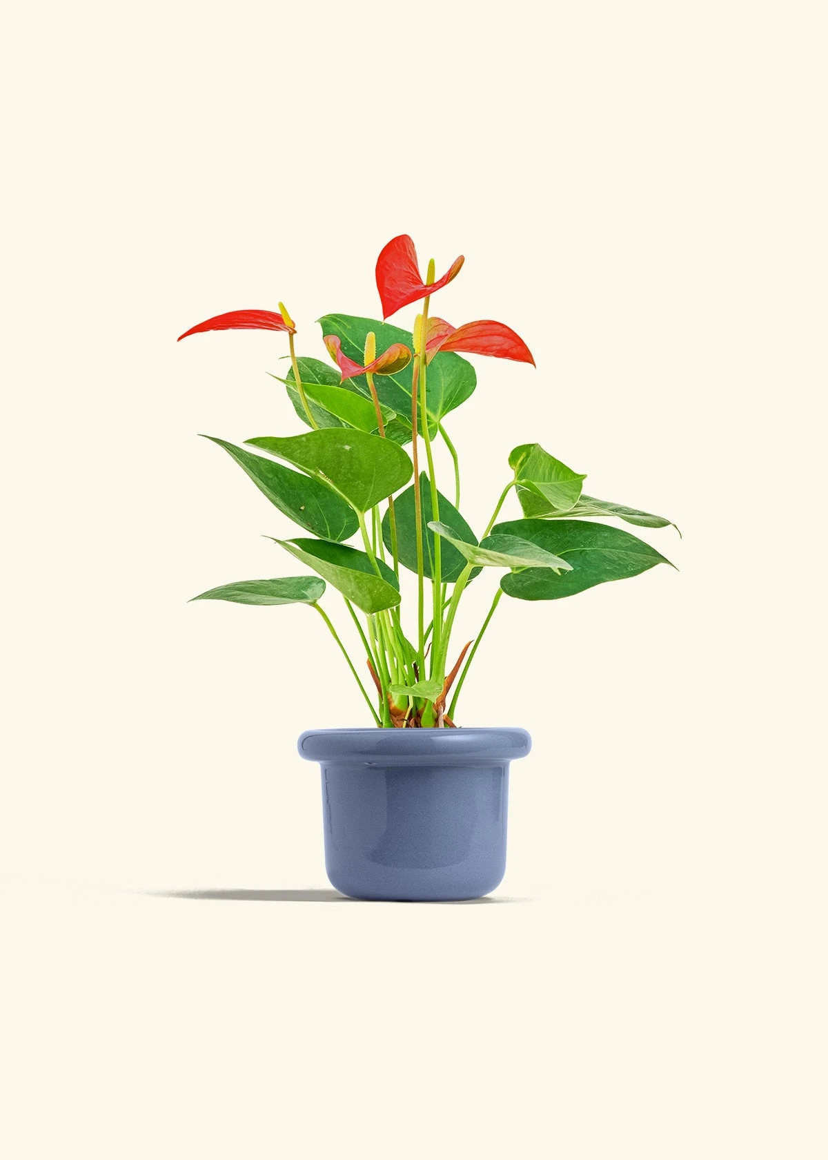 This anthurium has beautiful, red, heart-shaped “flowers” which are actually morphed leaves called spathes. Anthurium spathes are brightly colored to attract pollinators to the spadix (the flower spikes in the middle). It’s fairly low-maintenance, and blooms can last for 2-3 months in the right conditions.