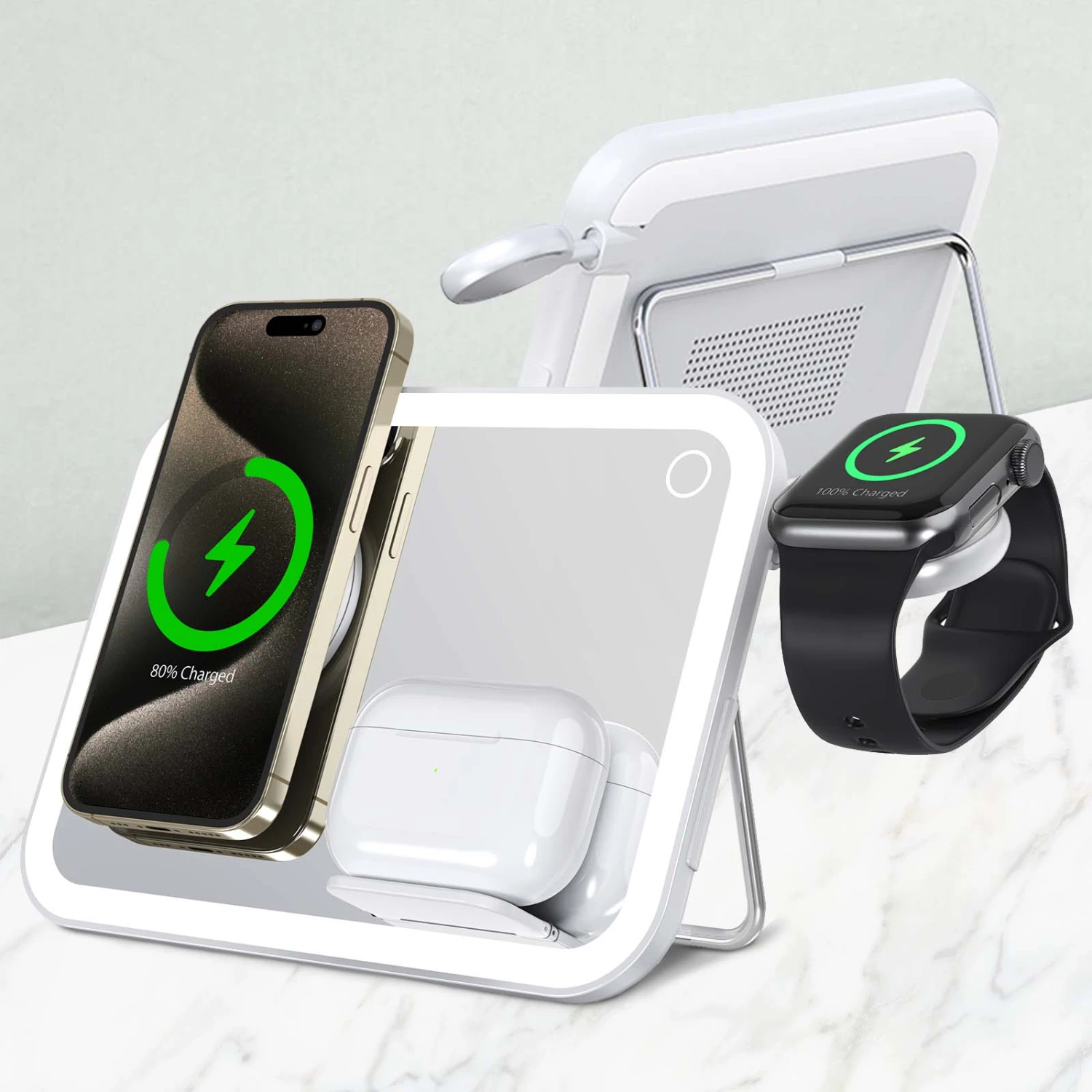 Simplify your life with the Kleva 3-in-1 Mirror Wireless Charger, the ultimate solution to declutter your space and charge your devices effortlessly. Designed for busy individuals, this sleek, multifunctional device combines wireless charging for your phone, watch, and headphones with a versatile mirror featuring adjustable lighting modes. Whether you’re getting ready at home or need a quick touch-up on the go, it keeps your essentials powered and your space stylishly organized.