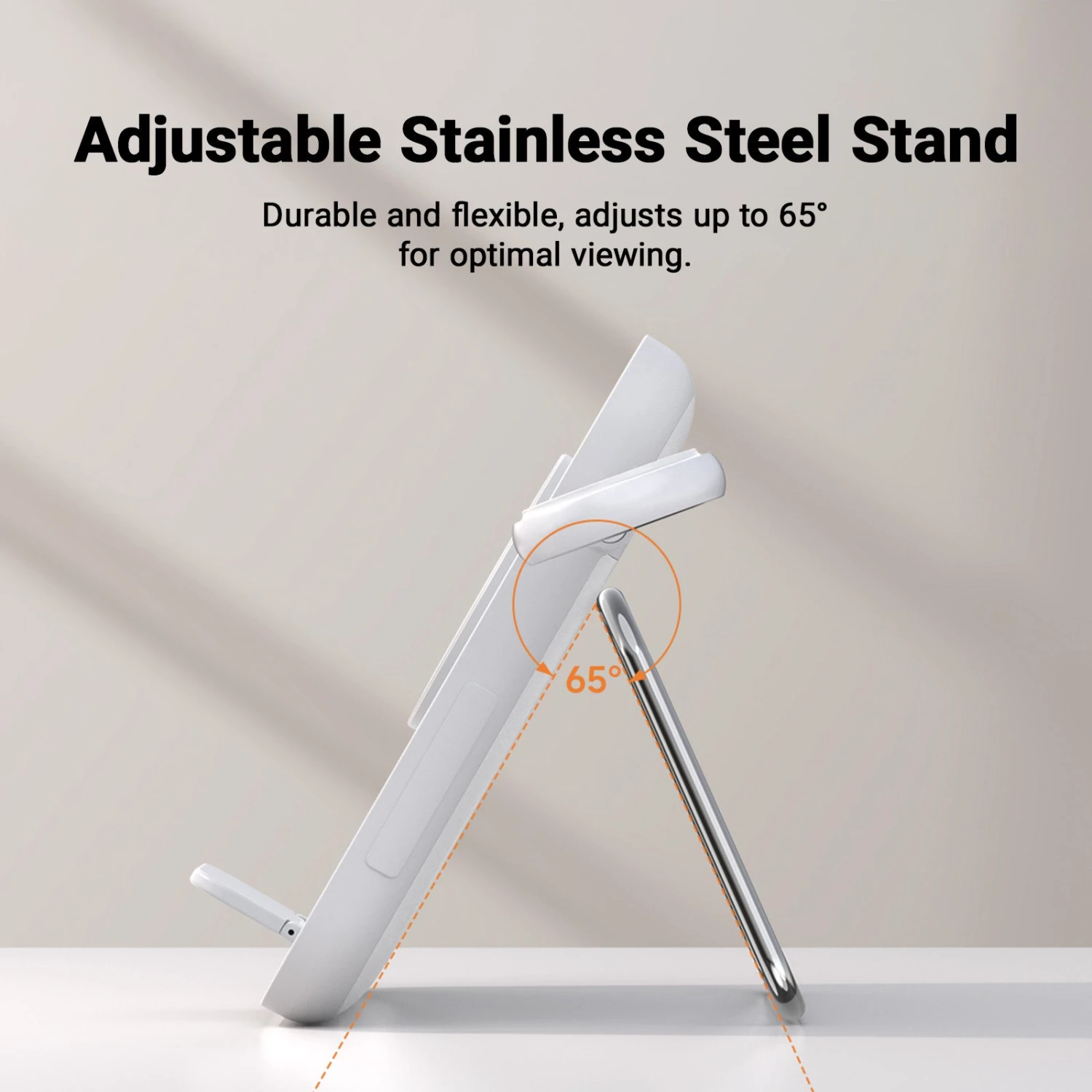 - Adjustable Stainless Steel Stand: Durable and flexible, adjusts up to 65° for optimal viewing.