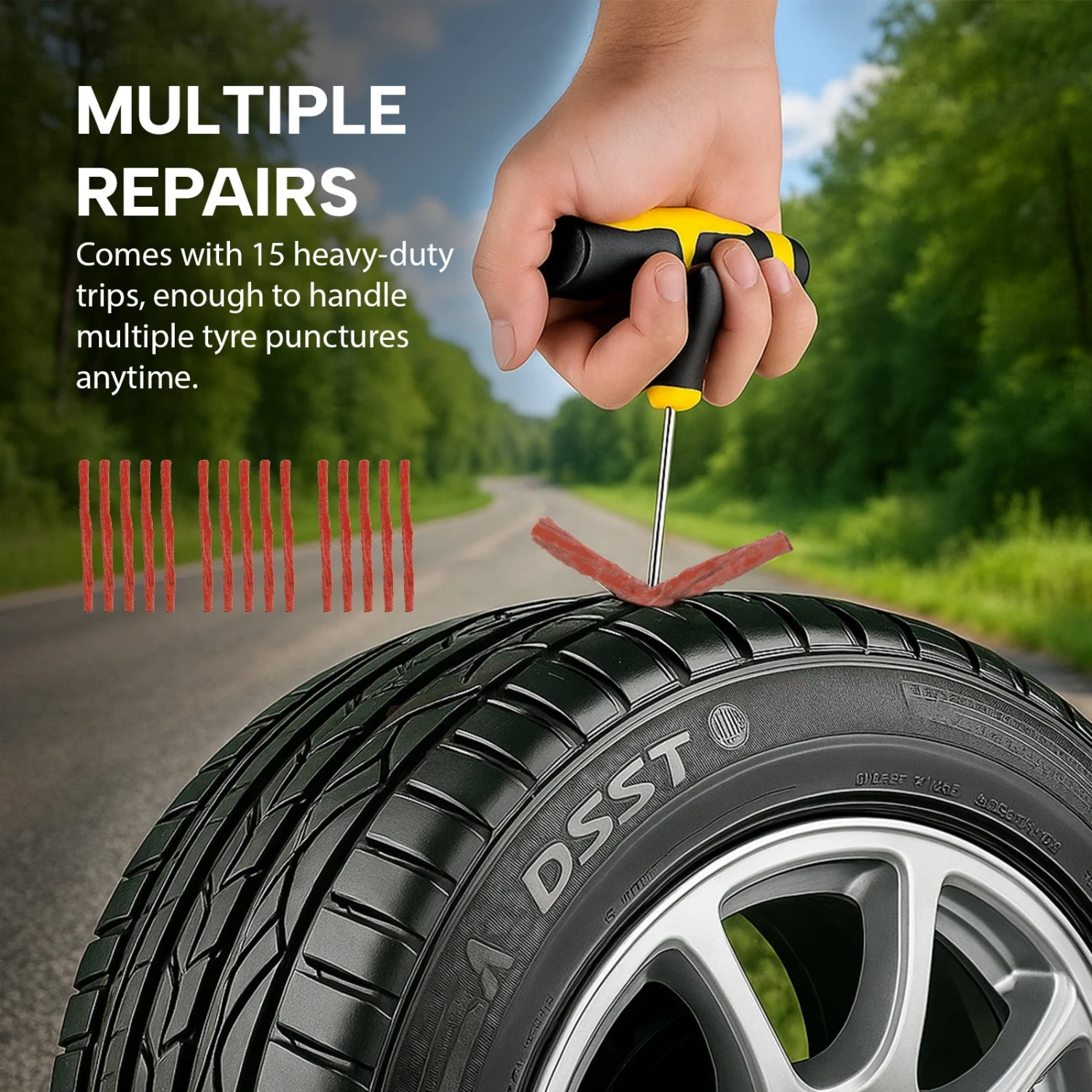 - 15 Heavy-Duty Rubber Strips: Multiple fixes in one kit—perfect for solo travellers, families, or road trip adventurers.