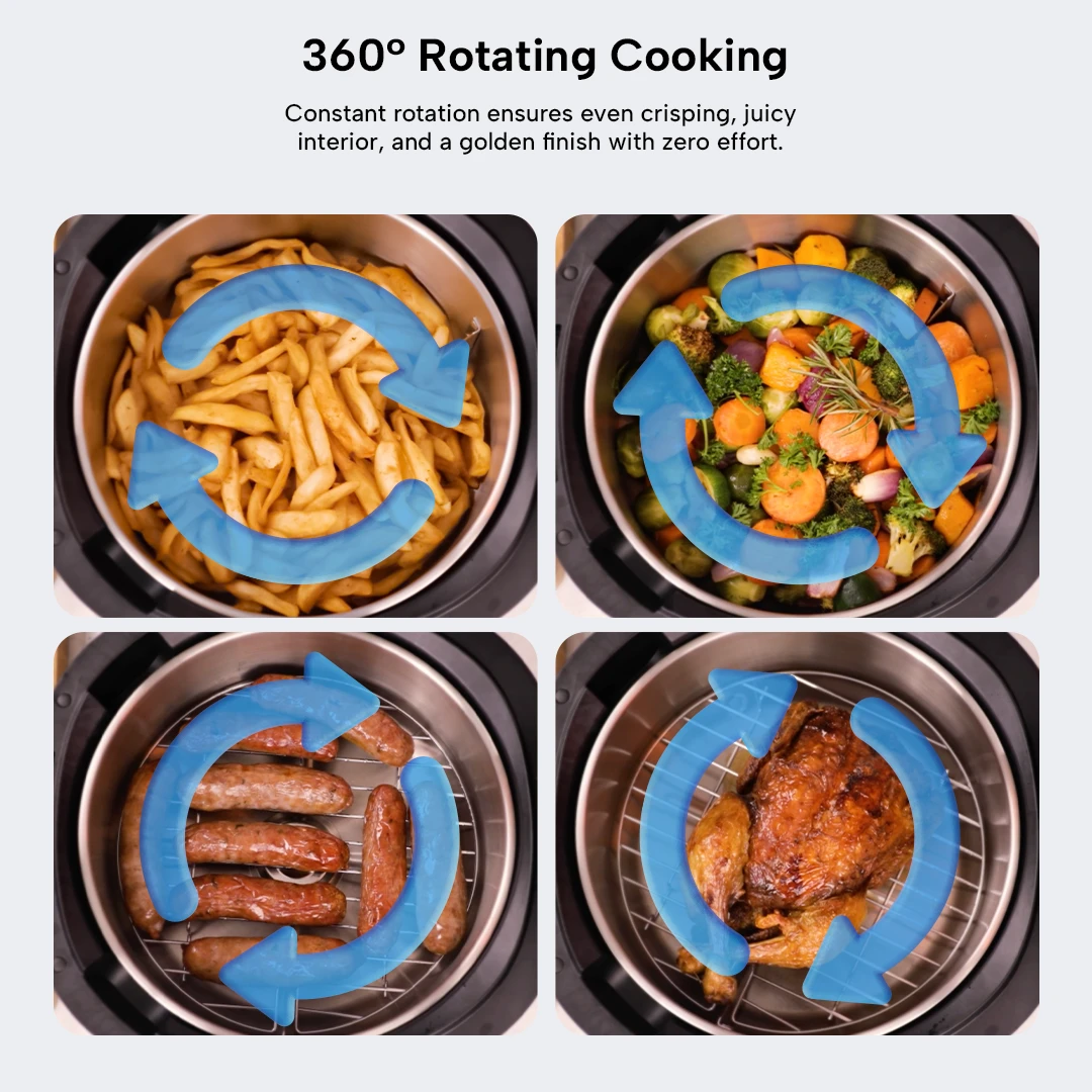 - 360° Rotating Cooking for Unmatched Crispiness: Designed with constant 360° rotation, it spins your food as it cooks—ensuring even crisping on all sides, a juicy interior, and a perfectly golden finish, all with zero effort on your part.