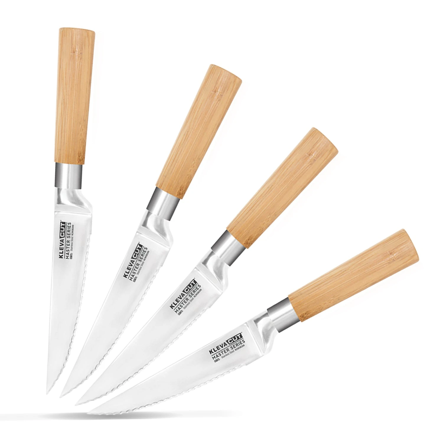 This 4 piece steak knife set combines style and sophistication along the superior ultra-sharp stainless steel blades. Ideal for home cooks and family meals or when entertaining guests. Every knife is designed with a tooth-like edge to provide a finer cut.
