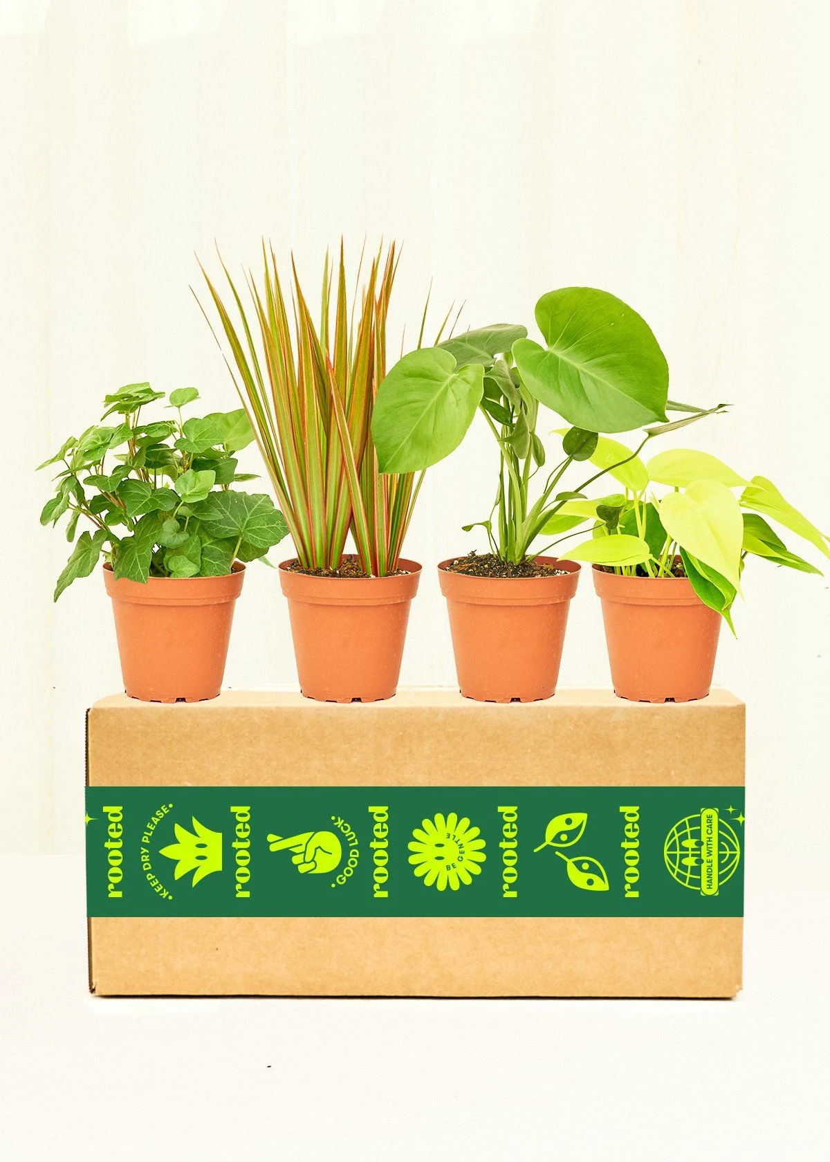Each box comes with four easy-care houseplants in 4″ grower pots.